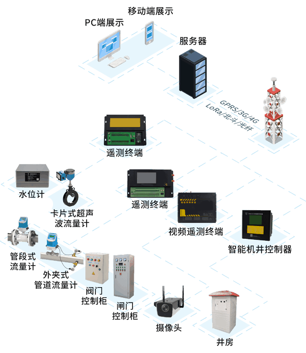 地下水取水计量监控设施:集远程监控、刷卡取水、自动计量用水用电、水泵控制等功能于一体,实现地下水取水自动计量、刷卡控制、远程传输的一体化安装。