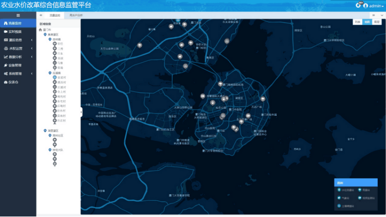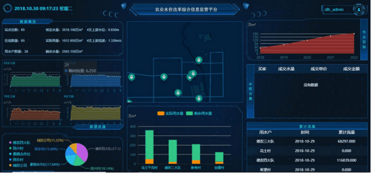 “灌区一张图”直观展现出监测站点的信息、运行状态、布局分布、用水户用水情况、交易情况及节水目标等。