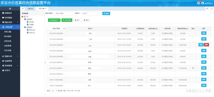 水权运营主要包括水权分配、水权交易、水权管理、节水申请模块。可快速查看当前所属区域的所有用水户的水权分配情况以及对用水户进行水权分配、节水申请、查看水权交易,通过色块方式直观展示用水户节水、超采情况。