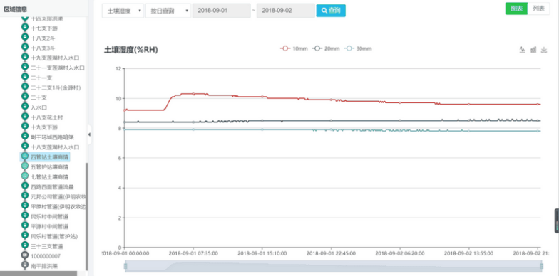 数据分析主要包括流量分析、用水户分析、土壤墒情分析、报警分析模块。可对站点进行流量分析、查看用水量、墒情情况分析以及记录报警信息。